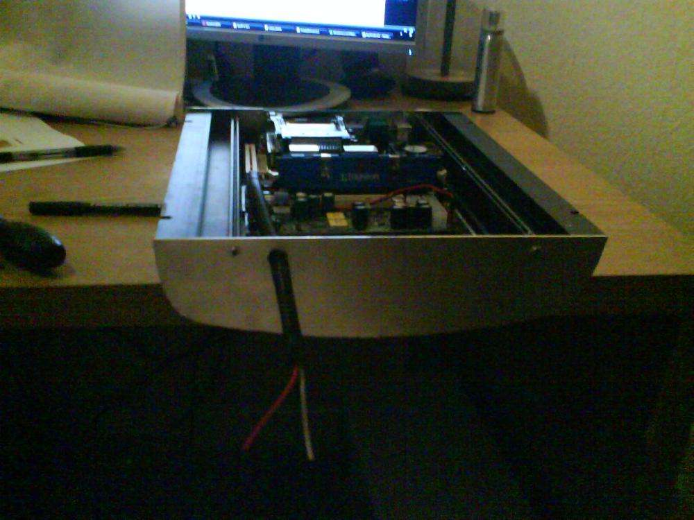 CarPC'en næsten samlet færdig! - Beklager kvaliteten er taget med mobil... Så er skærmen monteret :-D Det er rimelig sikkert at det bliver denne Leger lidt med frontends pt. Så fik jeg en skærm der virker :-) Overbliksbillede fra venstre <br> 1. Western Digital 3,5 2. M2-ATX 160w PSU